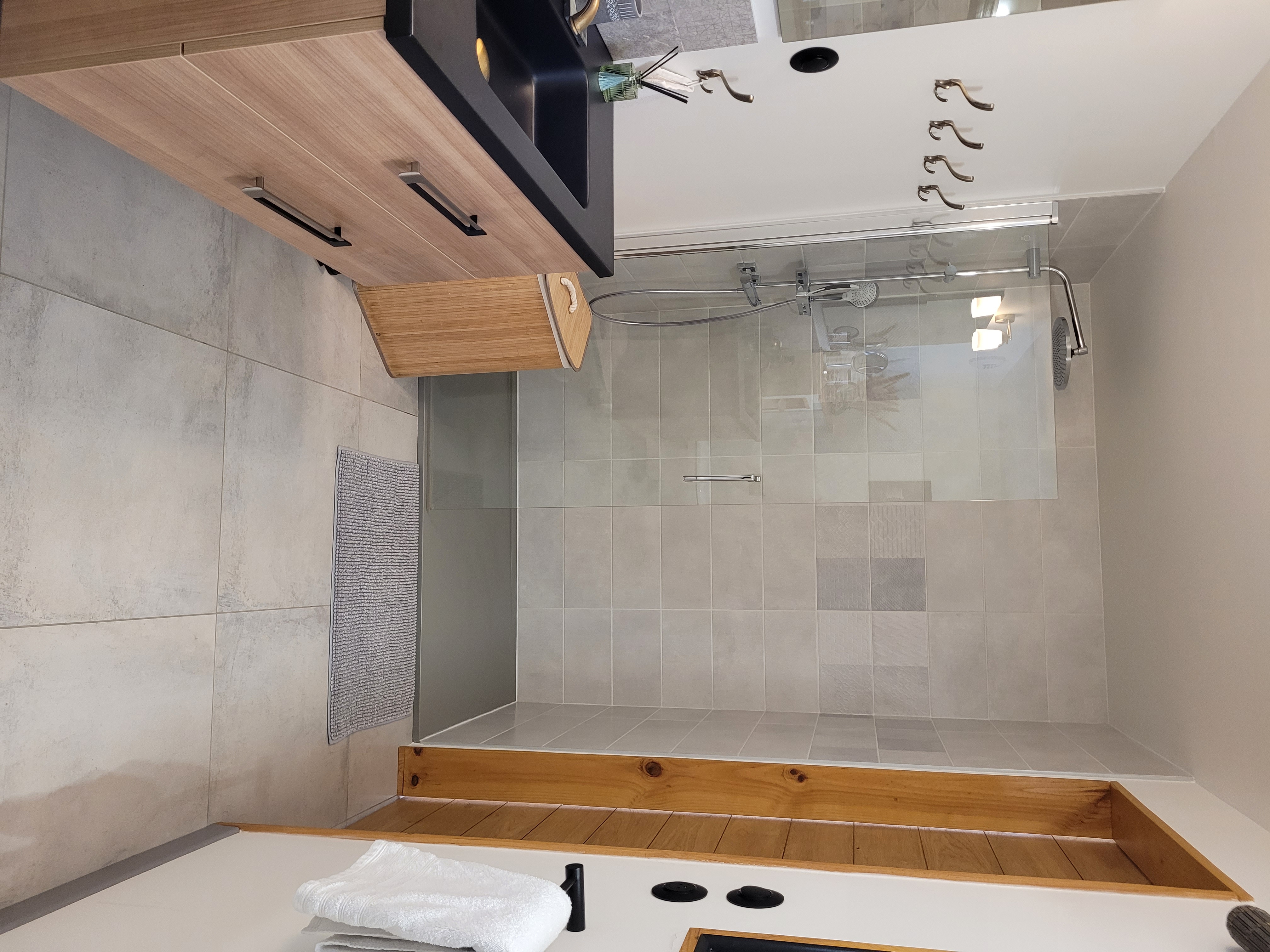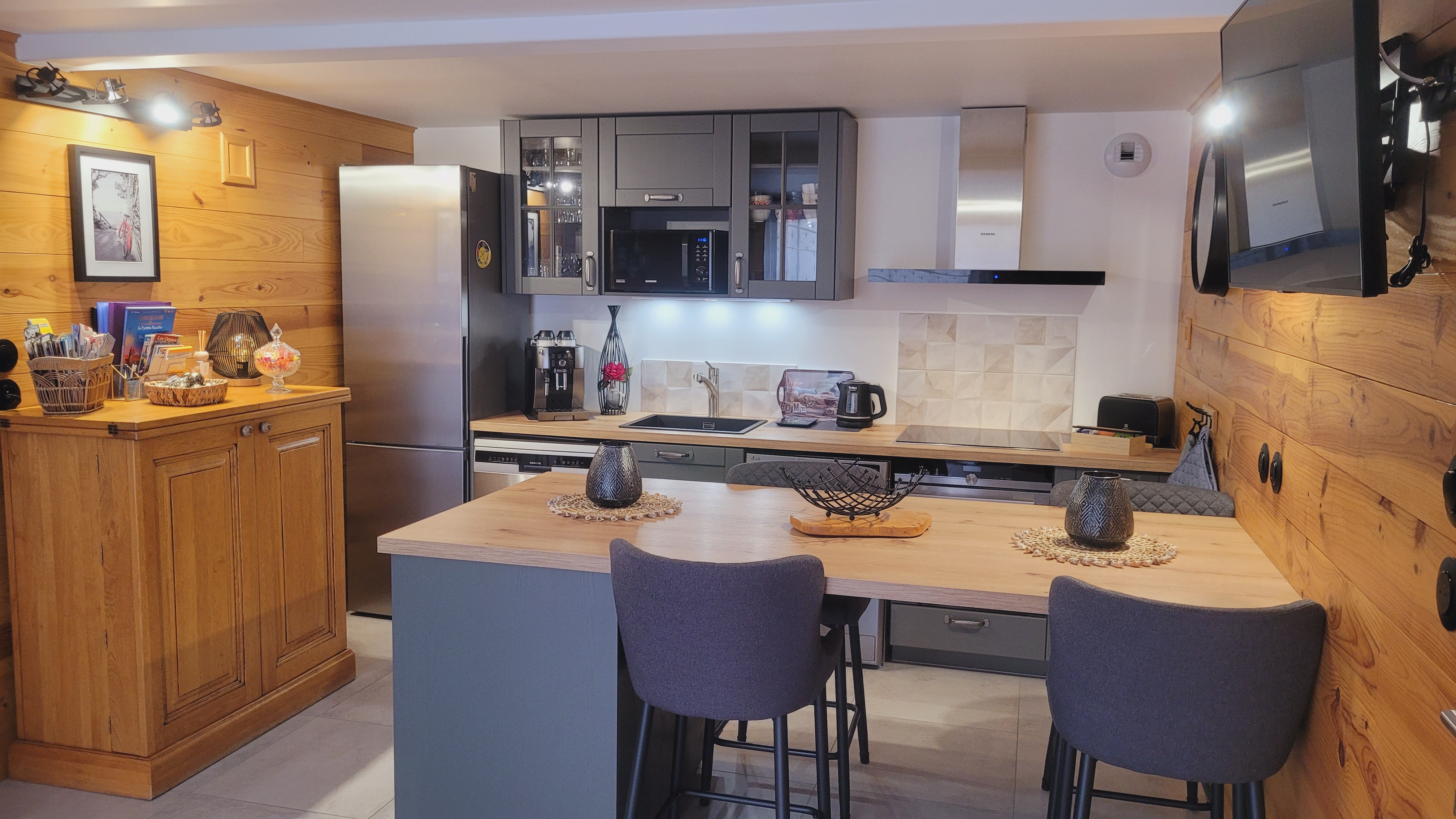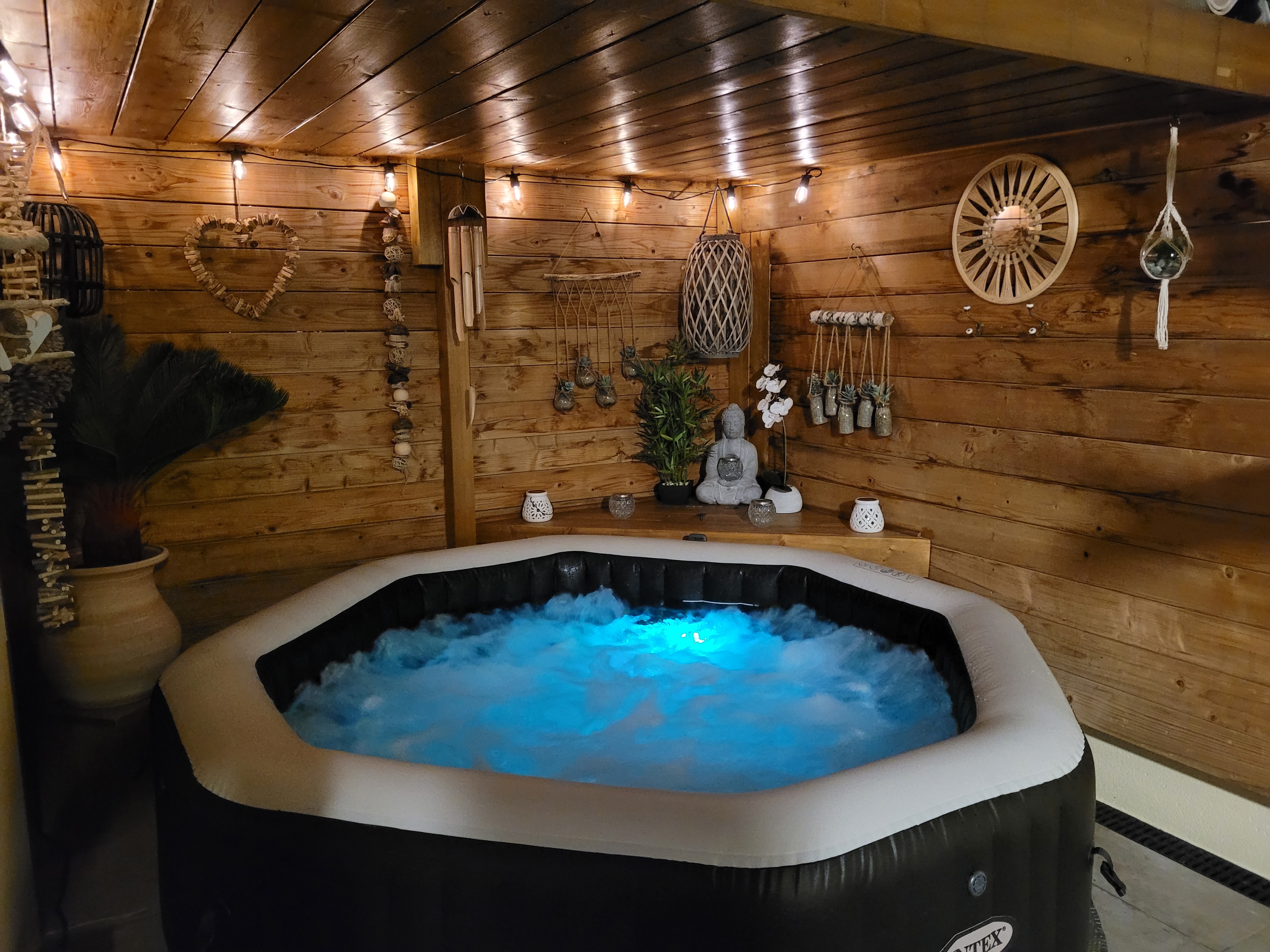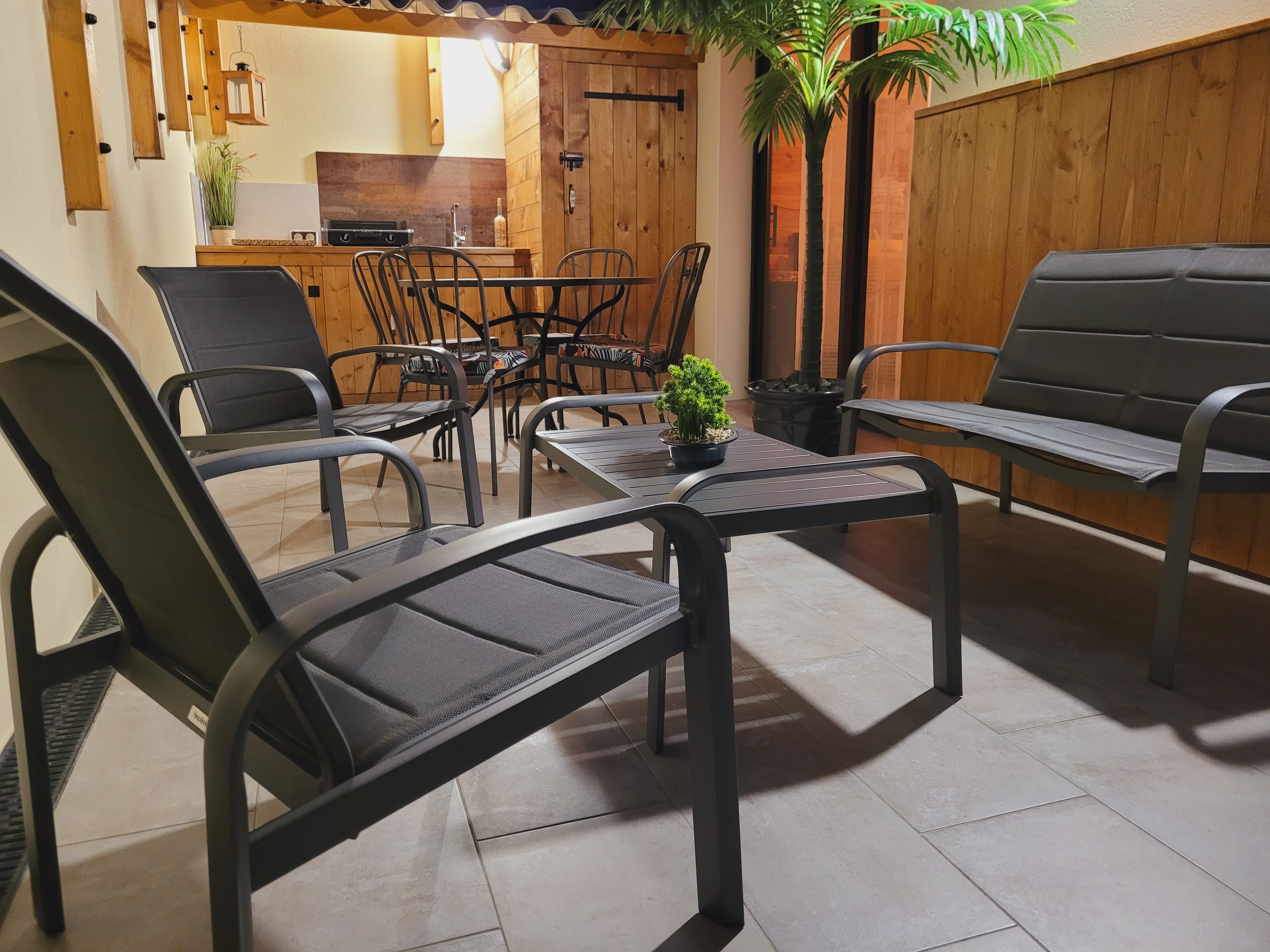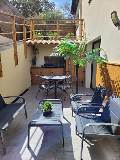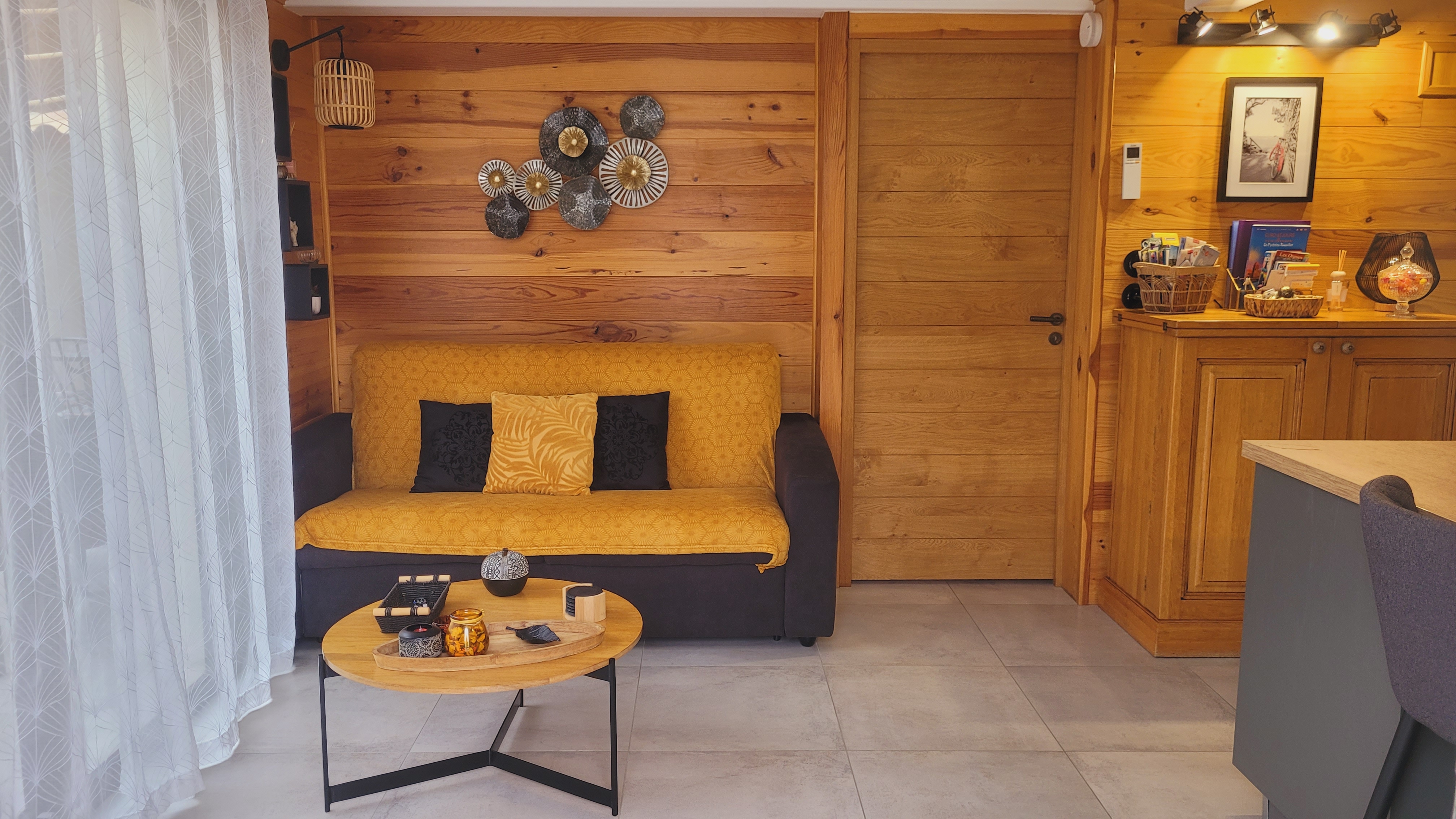 Cuisine équipée, espace salon avec canapé convertible, suite parentale ouverte sur une terrasse de 28m² avec jacuzzi. Salon de jardin et cuisine d’été pour partager des repas conviviaux.