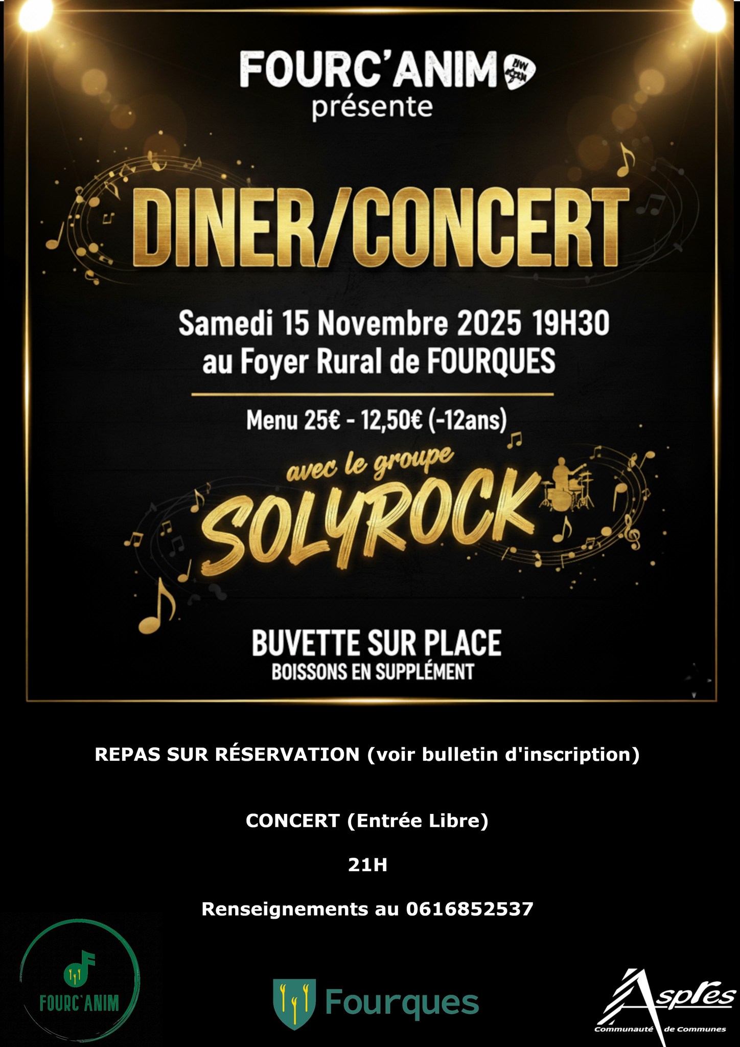 Nous sommes ravis de vous convier à notre prochain événement : DÎNER/CONCERT Samedi 15 Novembre 2025 Au Foyer Rural de FOURQUES Venez partager un ...