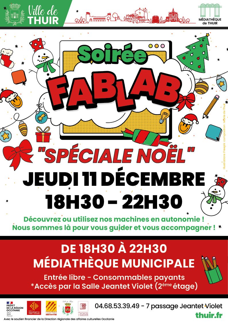Animations FABLAB à la Médiathèque Municipale de Thuir. Venez nombreux et initiez vous aux machines et logiciels et repartez avec vos créations...