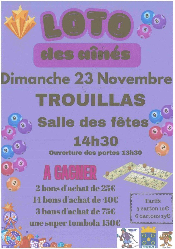 Le club des Aînés organise un loto le dimanche 23 novembre, à la salle des Fêtes. De nombreux lots à gagner : 2 bons d'achats de 25€ 14 bons ...