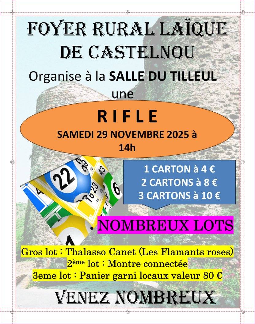 Le Foyer Rural de Castelnou organise une Rifle, Salle du Tilleul samedi 29 novembre à 14 H. De nombreux lots sont à gagner. Il vous sera proposé d...