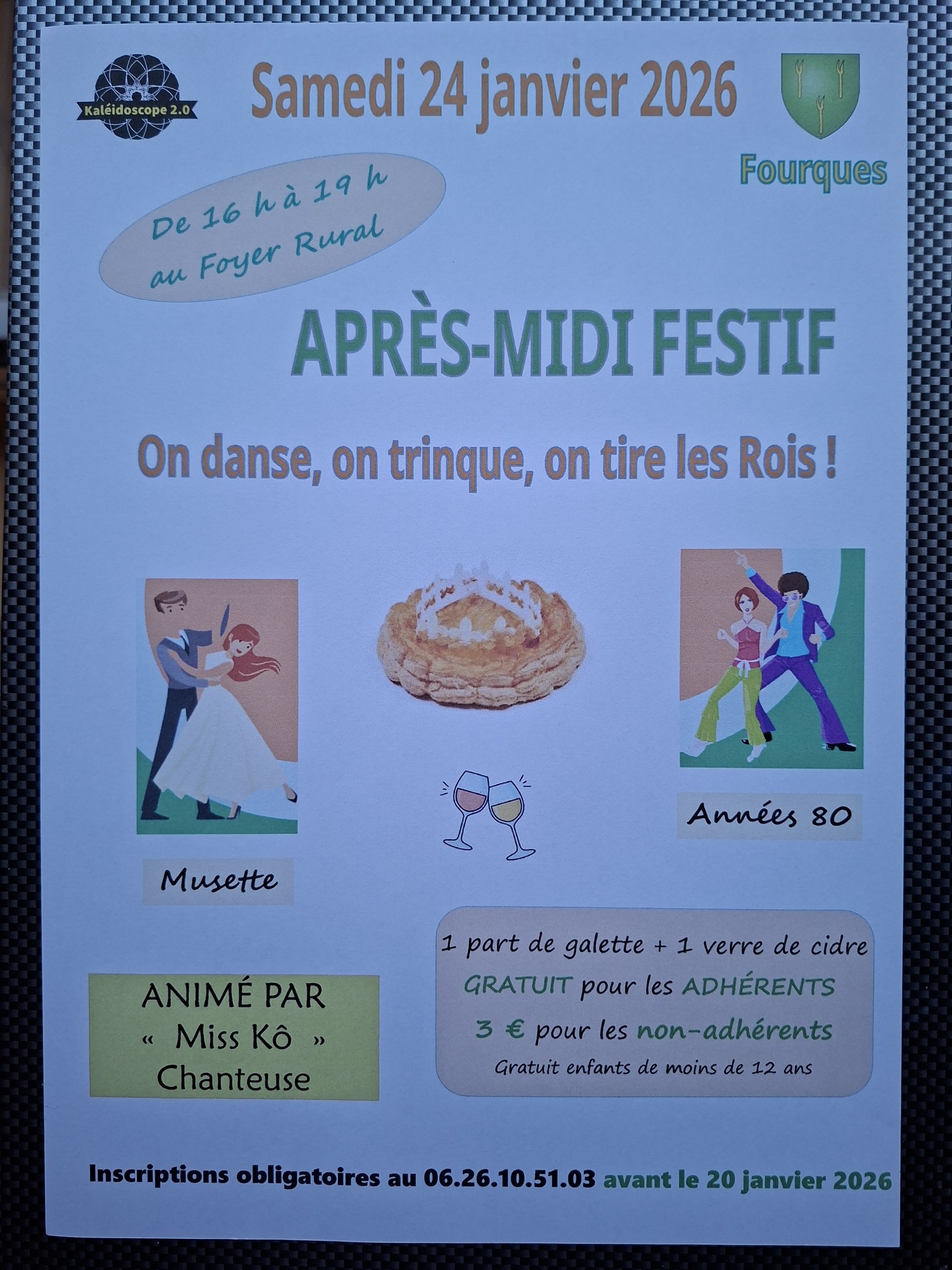 L'Association Kaléidoscope 2.0 vous propose de danser, trinquer et tirer les Rois samedi 24 janvier 2026 de 16 h à 19 h au foyer rural de Fourques (...