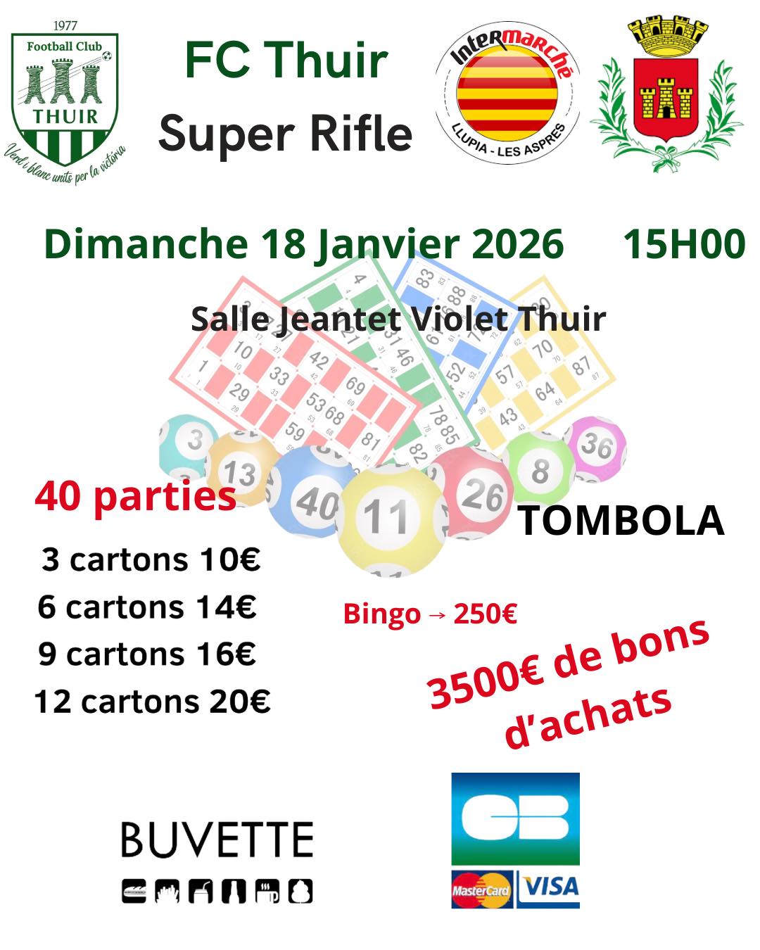SUPER RIFLE DU FC THUIR La toute première de l’année 2026 ! Dimanche 18 janvier 2026 15h00 Salle Jeantet Violet – Thuir 40 parties 3500â‚...
