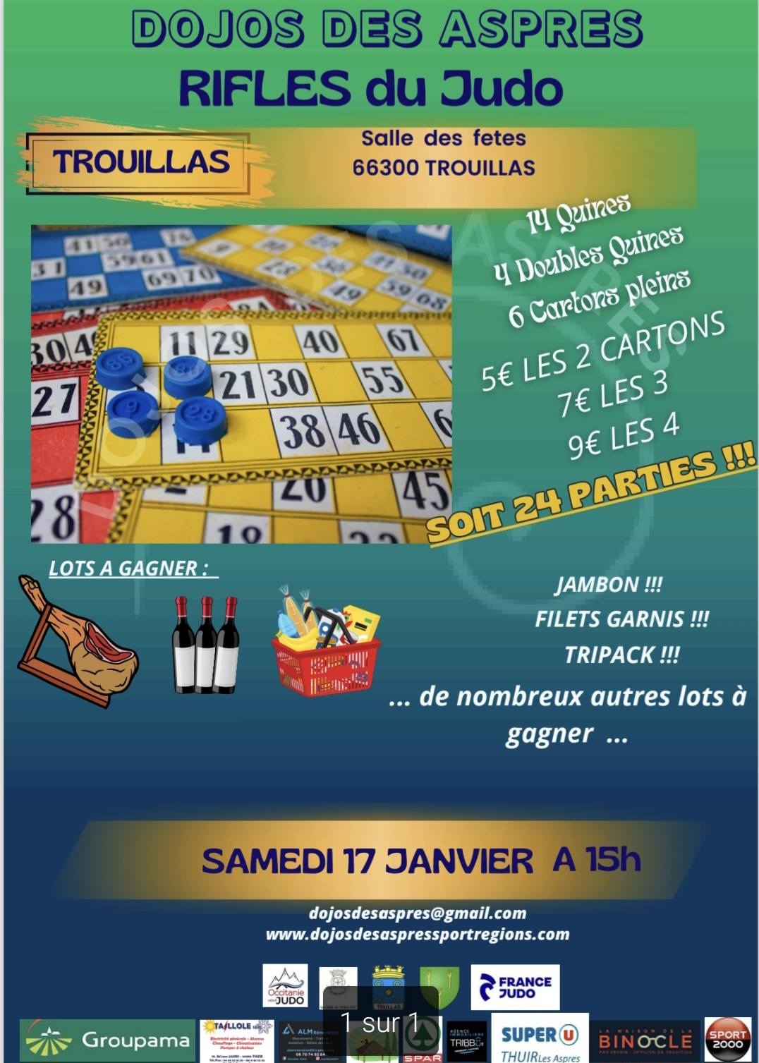 Le dojo des Apres organise une rifle à la salle de fêtes de Trouillas le 17 janvier, avec de nombreux lots à gagner. Jambon Tripack Et plein d'aut...